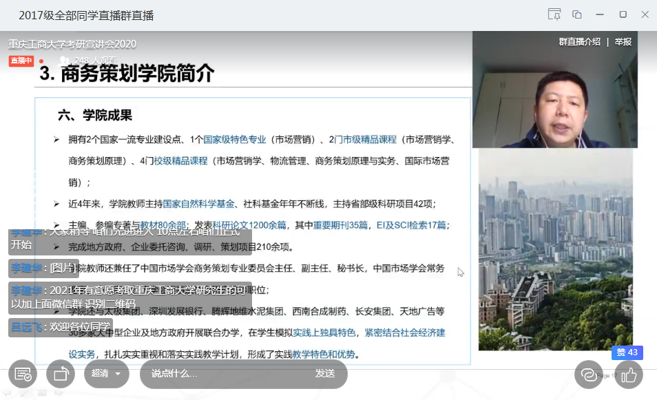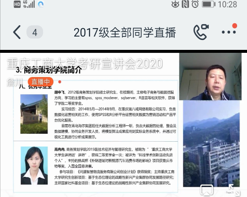 此次宣讲会经过数次与河南师范大学辅导员李建华老师沟通、协调得以如期举行。宣讲会通过钉钉直播的形式进行,河南师范大学商学院2017级、2018级部分未来有意考研的同学共600余人参与了此次直播。詹川首先介绍了重庆作为西部地区唯一的直辖市所具有的地域特点及发展优势,并对bat365中文官方网站的办学规模、研究生师资及研究生培养情况作了简要介绍。接着,詹川详细介绍了商务策划学院企业管理及技术经济及管理学术硕士、国际商务专业硕士的专业设置、办学特点、师资力量、培养模式、学生就业以及奖助体系等情况。随后,学院2017级技术经济及管理专业研究生、河南师范大学校友李肖依同学,分享了她的考研历程及读研期间的个人感悟和收获。此次线上宣讲会还对2021年有意报考bat365中文官方网站硕士研究生的同学们进行答疑解惑,以便同学们更加了解bat365官网,认识当前考研形势,以及制定切实有效的考研计划。