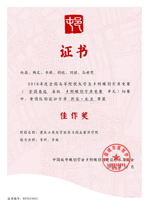 日前,从2019年度乡村发展研讨会暨第三届全国高等院校城乡规划专业大学生乡村规划竞赛方案评优会传来喜讯,bat365官网旅游与国土资源学院2017级人文地理与城乡规划专业学生向磊、杨文、胡艳、韦婷、高世雪、2017级旅游管理专业学生刘瑶(指导教师:曹珂、李斌)的作品《共安•永生》获得佳作奖。