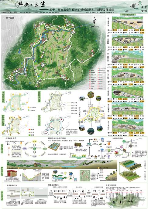 参赛小组选取了位于重庆市北碚区金刀峡镇永安村作为调查基地,总结村庄土地撂荒、交通不便、产业薄弱等现存问题,反思传统村落静态、单一的发展模式。同时,基于“复合共生”理念,探索出了一条产业融合发展、生态共同维护、生活和谐美好、文化延续辉煌、治理转型升级的发展道路,以第一产业联动二三产业,真正做到“藏粮于技,藏富于民”。