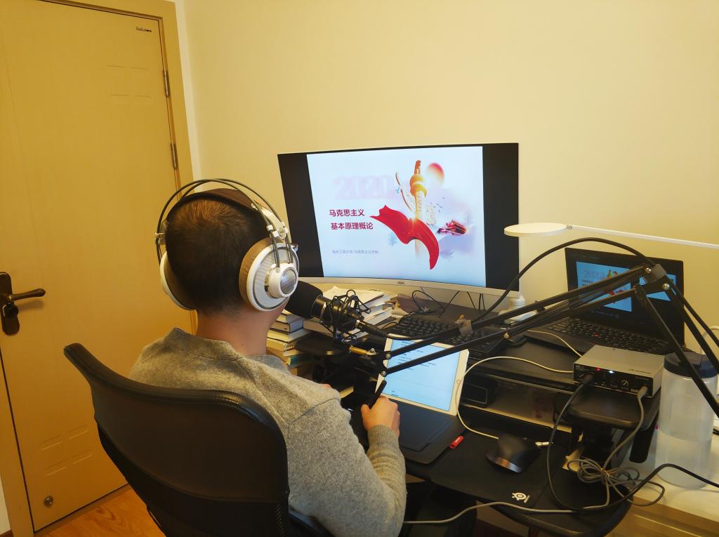 王佳鑫,男,bat365中文官方网站马克思主义学院专职教师。线上授课是一次展示自己教学课件和教学语言功底的宝贵机会。如何通过线上教学这一特殊方式为学生讲好马克思主义哲学、让学生真懂真信马克思主义政治经济学,是促使他为教学做精心准备的原动力。在学校线上教学通知下达后,他便迅速采购了各类视频、音频设备,在不断摸索下成功组建了直播平台,并做好了调试。他在线上教学时,为需要详细讲解的页面留下了比较多的空白,充分利用手写笔这一重要工具,即时标记重点和书写板书,增强了学生上课的参与度,使教学实时展示有了更大的自由度。王老师说,“从教学结束后学生的反馈来看,有了‘好声音’,才能出‘好戏’,一套好设备至少可以让学生听起课来没那么烦躁。许多学生纷纷给我留言,虽然有些想法很‘调皮’,但更多的还是真诚的支持和鼓励。”