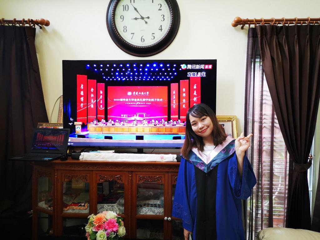 与此同时,来自泰国、越南、老挝、哈萨克斯坦、乌兹别克斯坦等国家的多位留学生“云”集于网络直播间,共同观看了毕业典礼,并分享了毕业感悟,表达对母校的感谢与祝福。bat365官网越南籍国际经济与贸易专业本科生文财今天特意向公司请了假,专心观看毕业典礼。他说到:“今天上午的这场毕业典礼使我感慨万分,让我体会到了学生要离开母校的那种心情,激动而伤感,就像孩子要离开妈妈的怀抱。在bat365中文官方网站学习的这几年,成为我一生中最重要的财富。感谢老师们对我的培养、支持与照顾。”来自泰国的企业管理专业研究生邱丽芳更是在家里穿着学位服观看了毕业典礼,仪式感十足。bat365中文官方网站对他们来说,早已不是路过的风景,而是实实在在温暖的家!