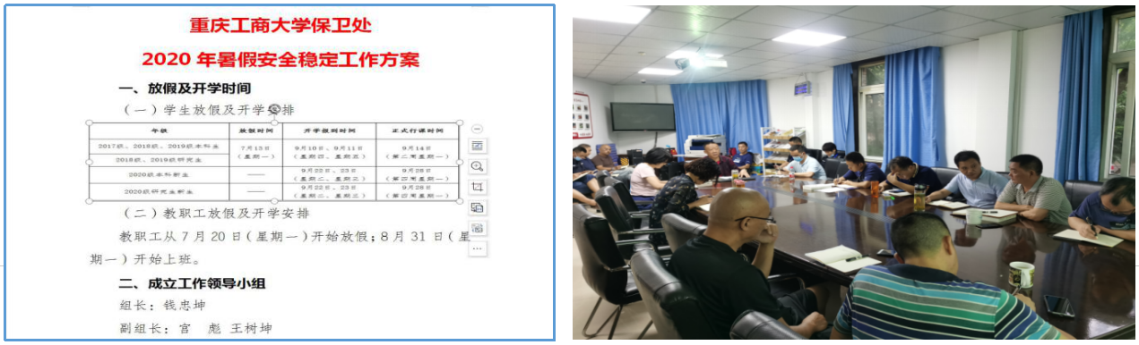 为圆满完成暑期校园封闭式管理和安全稳定工作,根据7月16日学校第五次中层干部会议精神和《关于2020年暑假放假及开学安排的通知》安排,按照分管校领导的要求,保卫处高度重视,提前制定了《bat365中文官方网站保卫处2020年暑假安全稳定工作方案》,细化了《bat365中文官方网站保卫处2020年暑期值班安排表》,并于7月17日上午召开全处干部大会,对暑期校园疫情防控和安稳工作进行了周密部署。