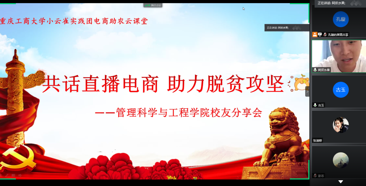 7月28日下午两点,管理科学与工程学院电商助农云课堂正式开始。学院陈春洁副书记首先致辞,欢迎胡欢和史亚飞的到来。胡欢是重庆市创业优秀人物,抖音生鲜行业的佼佼者,创办了欢果电子商务有限公司,