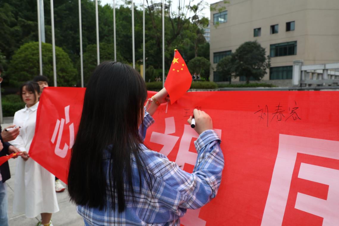 升旗仪式结束后,同学们在国旗下用响亮的口号庄严宣誓,并在横幅上庄严签字,表达了重工商大学子浓厚深切的爱国之情。