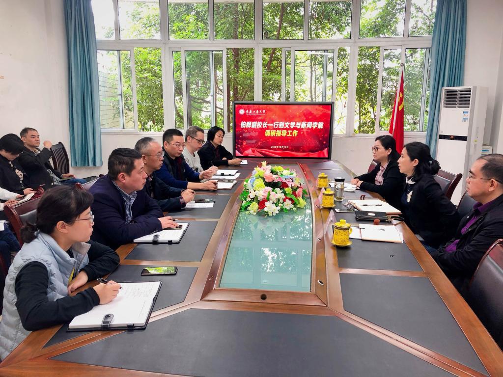 近日,学校副校长柏群到文学与新闻学院调研并座谈。研究生院院长田双全,科研处处长任毅,文学与新闻学院党政班子及科室负责人、系主任等参加了座谈会。