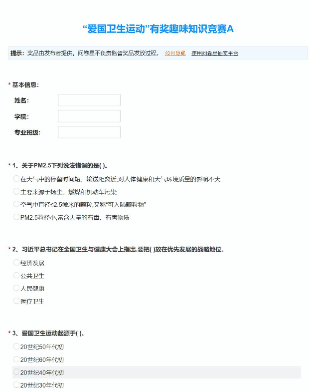 10月30日,为更好地让同学们学习卫生防疫和健康保健知识,提高防范意识,减少不必要的聚集活动和外出,校义协举办了线上“共践爱国卫生·携手抗击疫情”知识竞赛。500余名同学积极参与,通过三轮激烈紧张的竞答,来自体育学院的付文艳等同学获得一等奖,来自工商管理学院的安校玉等同学获得二等奖,来自会计学院的刘怡瑾等同学获得三等奖。此次“共践爱国卫生·携手抗击疫情”线上知识竞赛主要包括爱国卫生精神、抗击疫情概况、预防疫情常识等几方面的内容,同学们积极参与,踊跃答题,通过比赛增强了对爱国卫生和抗疫知识的学习和提高。