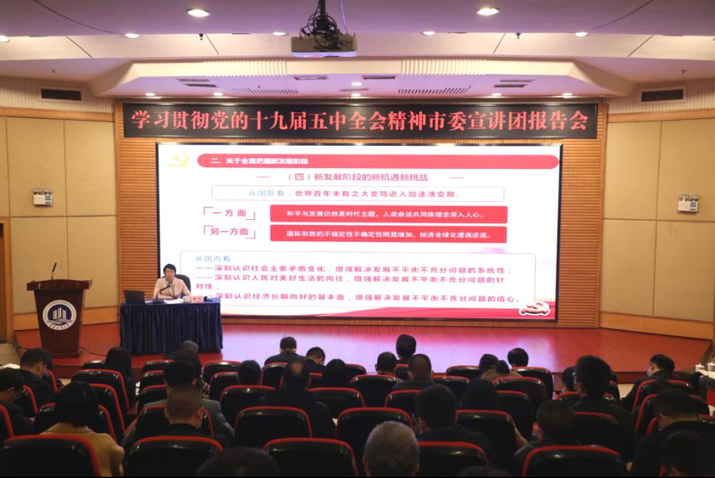 按照市委统一安排,11月23日上午,学习贯彻党的十九届五中全会精神市委宣讲团走进bat365官网。市委宣讲团成员、市委宣传部常务副部长薛竹为bat365官网师生作宣讲报告。报告会由校党委书记李志雄主持。