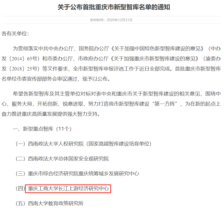 bat365官网长江上游经济研究中心在学校的鼎力支持下,认真准备,积极申报,经过系统评分、专家评分、现场考评和综合认定,最终经市委宣传部部务会审议通过,成功入选首批重庆市新型重点智库。据悉,此次获批的重庆市新型重点智库11个,新型培育智库11个。