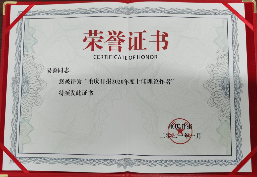 李敬教授的理论文章《重庆经济“由负转正”的逻辑与未来展望》紧跟热点,突出重庆经济增速“由负转正”这一主题,分析重庆经济“由负转正”的逻辑,展望重庆经济未来发展,具有较强的理论意义和实践价值,刊发后社会反响较好,入选“重庆日报2020年度十佳理论文章”。易淼教授获评“重庆日报2020年度十佳理论作者”。座谈会上,李保海和曾维伦先后为“十佳理论文章”的作者和“十佳理论作者”颁奖。