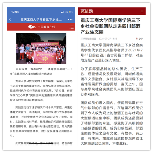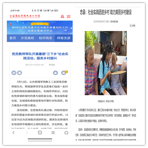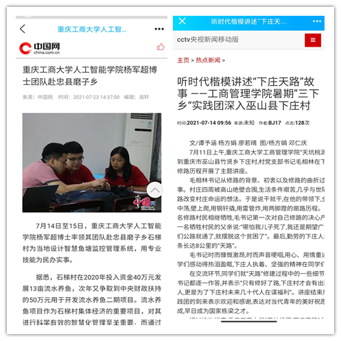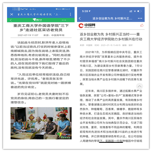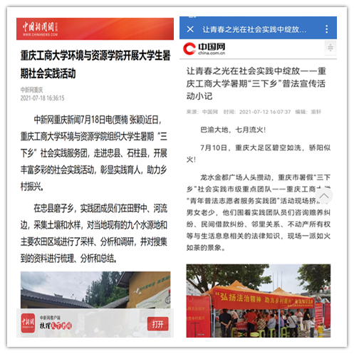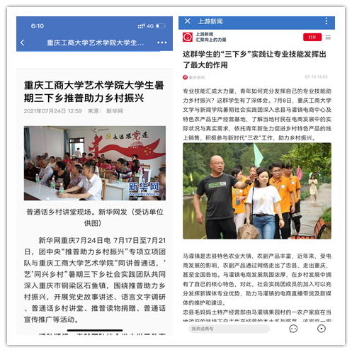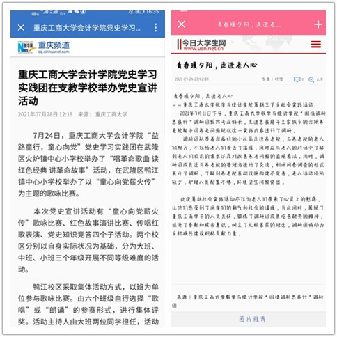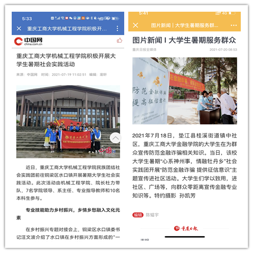 在实践活动期间,各学院创作多种类型的高质量社会实践作品,如《益路童行,童心向党--bat365中文官方网站会计学院党史学习实践团在支教学校举办党史宣讲活动》《重庆工商学子赴古蔺县 看贫困户"搬"出幸福新生活》《返乡创业敢为先 乡村振兴正当时——bat365中文官方网站经济学院助力乡村振兴在行动》《脱贫不忘来时路,乡村振兴靠大家——bat365中文官方网站工商管理学院暑期“三下乡”实践团深入重庆市巫山县下庄村》等,引领广大青年学生在扎根中国大地的生动实践中增强“四个意识”、坚定“四个自信”、做到“两个维护”。实践团深入乡村基层,走访调查,理论宣讲,服务社会,在社会实践的亲身经历中受教育、长才干、做贡献,得到了当地群众及社会的认可,同时实践活动被新华网、人民网、中国青年网、央广网、中国网、中视网、重庆晚报、上游新闻、中国教育在线等多家媒体报道。