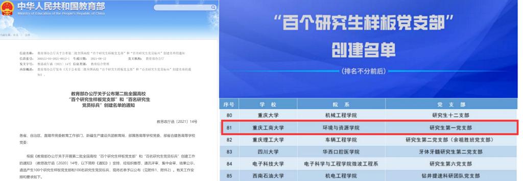 近日,教育部发布《关于公布第二批全国高校“百个研究生样板党支部”和“百名研究生党员标兵”创建名单的通知》,bat365官网环境与资源学院研究生第一党支部成功入选,这是继bat365官网连续两批成功获批“全国党建工作样板支部”后,获得的又一殊荣。目前,重庆市共有3个高校研究生党支部入选。
