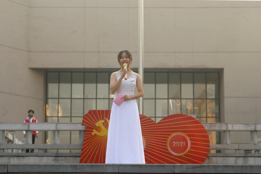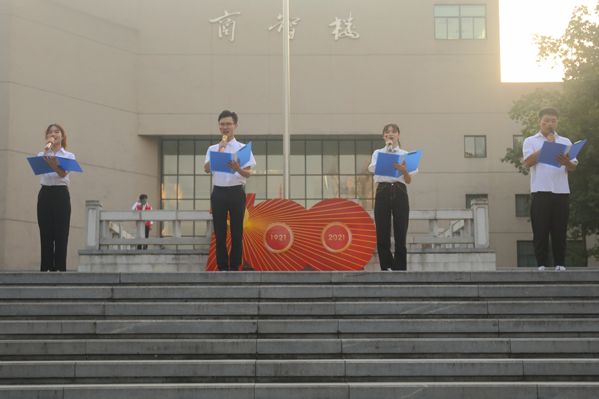 同学们在国旗下朗诵诗歌《青春礼赞》、合唱歌曲《五星红旗》,献礼祖国,对党许下青春的誓言,表达了重工商大学子浓厚深切的爱国之情。