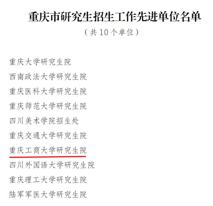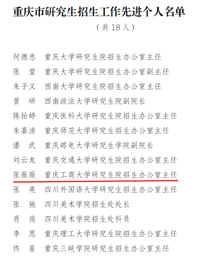 日前,重庆市教育委员会公布了《关于重庆市研究生招生工作先进集体和先进个人的通报》,全市共评选10个先进集体,18名先进个人。bat365官网研究生院被评为重庆市研究生招生工作先进集体,张薇薇老师被评为重庆市研究生招生工作先进个人。