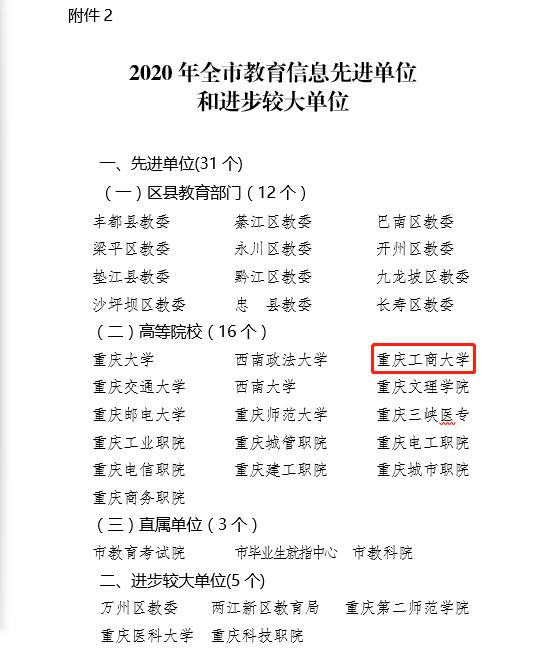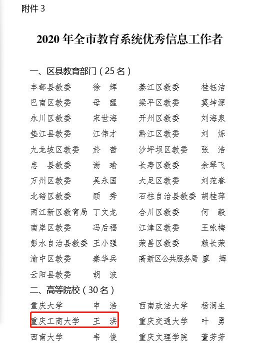 近日,重庆市教育委员会公布了《关于2020年教育信息工作情况的通报》,bat365官网在全市高校信息工作中得分排名第三,被评为重庆市教育信息工作先进单位,党政办王洪同志被评为重庆市教育系统优秀信息工作者。
