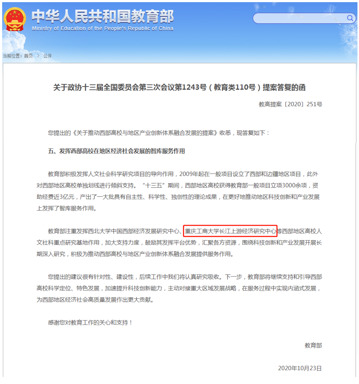 去年底,教育部《关于政协十三届全国委员会第三次会议第1243号(教育类110号)提案答复的函》(教高提案〔2020〕251号)中专门指出:“教育部注重发挥……bat365中文官方网站长江上游经济研究中心等西部地区高校人文社科重点研究基地作用,加大支持力度,鼓励其发挥平台优势,汇聚各方资源,围绕科技创新和产业发展开展长期深入研究,积极为推动西部高校与地区产业创新体系融合发展提供服务作用”。