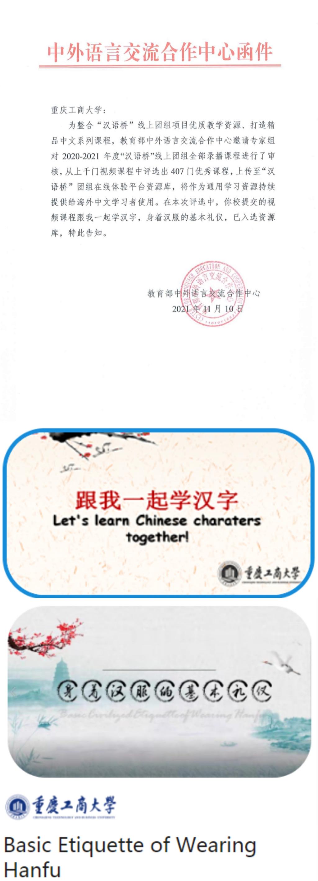 近日,bat365官网接教育部中外语言交流合作中心函告,留学生院制作的《跟我一起学汉字》和《身着汉服的基本礼仪》两门课程被教育部中外语言交流合作中心专家组评为优秀课程,入选语合中心精品教学资源库。
