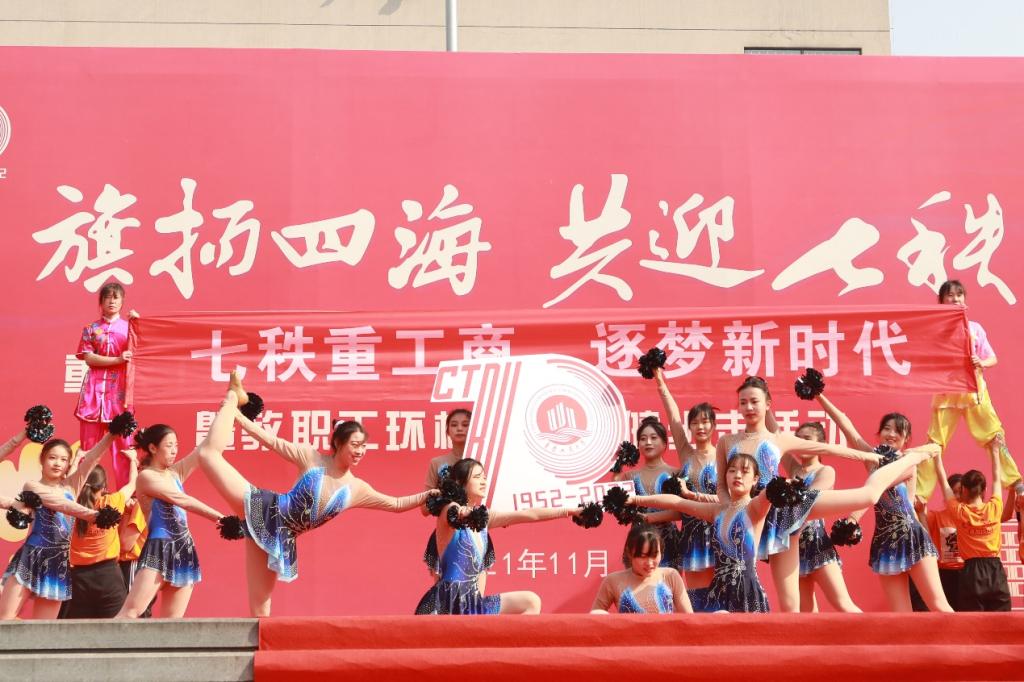 活动开始前,体育学院学生啦啦操代表队和武术代表队为观众带来了精彩的热场表演。同学们拉出了“七秩重工商,逐梦新时代”的横幅,点燃了全场师生校友的热情。