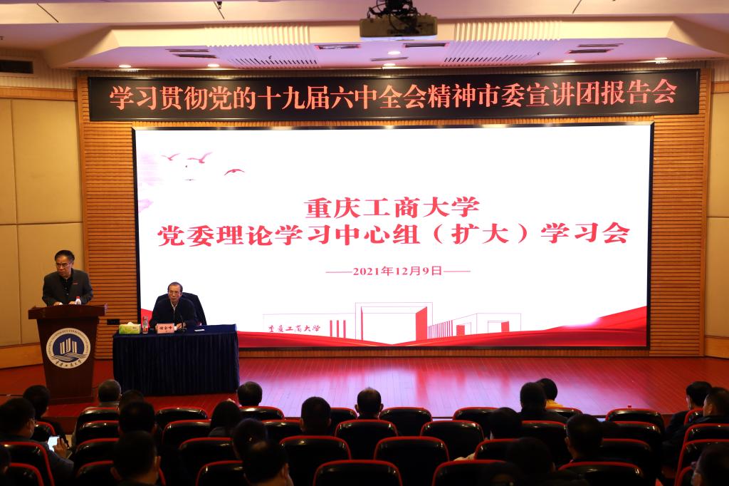 12月9日下午,bat365官网召开党委理论学习中心组(扩大)学习会,深入学习贯彻党的十九届六中全会精神。市委宣讲团成员、市委党校(重庆行政学院)常务副校(院)长谢金峰同志为bat365官网师生作专题辅导报告。校党委书记李志雄主持会议并讲话。