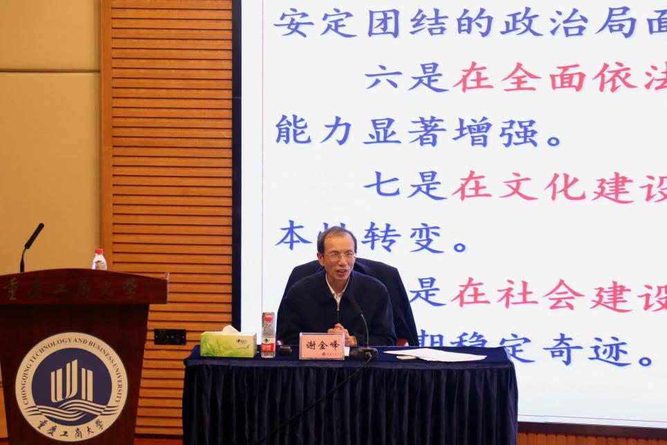谢金峰从基本情况、重要意义、主要内容、努力方向四个方面对十九届六中全会精神进行了系统宣讲和深入阐释。他指出,党的十九届六中全会是在党成立100周年的重要历史时刻,“两个百年”奋斗目标历史交汇的重大历史关头召开的一次重要会议,体现了党重视和善于运用历史规律的高度政治自觉,体现了党牢记初心使命、继往开来的自信和担当。全会审议通过的《中共中央关于党的百年奋斗重大成就和历史经验的决议》,融汇了百年来中国共产党践行为中国人民谋幸福、为中华民族谋复兴的初心使命所进行的奋斗、牺牲和创造,深刻揭示了“过去我们为什么能够成功、未来我们怎样才能继续成功”。全会提出并写入《决议》的“两个确立”,是十八大以来最重要的政治成果,是体现全党共同意志、反映人民共同心声的重大政治判断。他深入解读了全会对实现中华民族伟大复兴而产生的重大政治、历史、现实意义,细致讲解了学懂弄通全会精神需要从“历史成就、历史意义、历史经验、历史使命、历史结论、历史自信、历史自觉、历史担当”这“八个关键词”去系统把握,并指出要通过“六个学会”即学会学习、学会实干、学会总结、学会包容、学会谦虚、学会自律,把全会的思想真正做到内化于心、外化于行、转化为果。