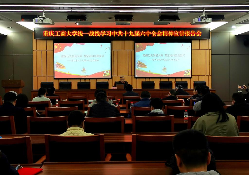 根据学校党委印发的《bat365中文官方网站关于学习宣传贯彻党的十九届六中全会精神深化拓展党史学习教育的工作方案》的安排,结合学校统一战线开展“学党史、讲《条例》、增合力、促发展”大走访大谈心活动,12月8日下午,学校党委统战部在新图书馆会议中心一会议室举办统一战线学习中共十九届六中全会精神宣讲报告会,各民主党派基层组织和统战团体班子成员及统战成员代表共计50余人参会。