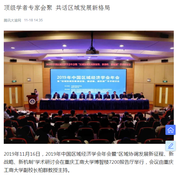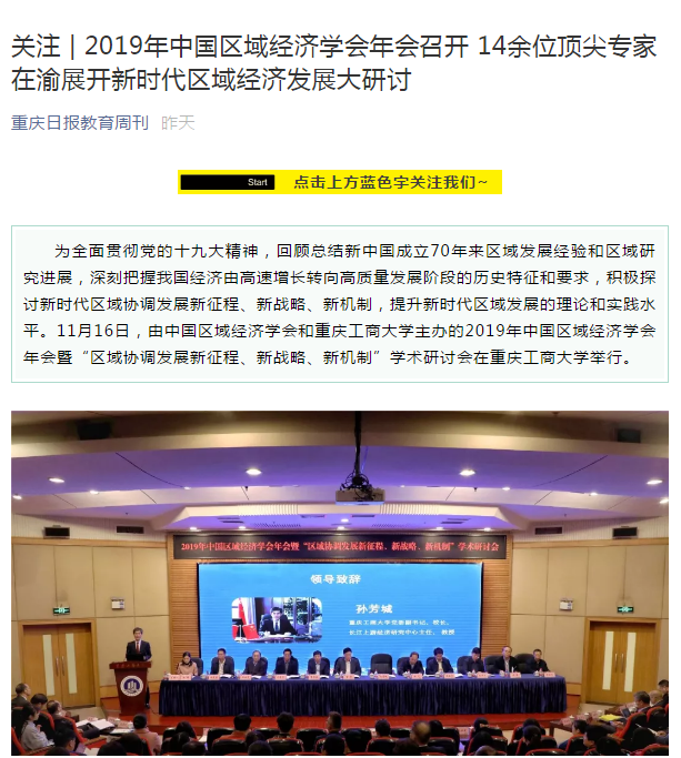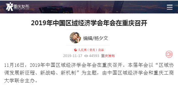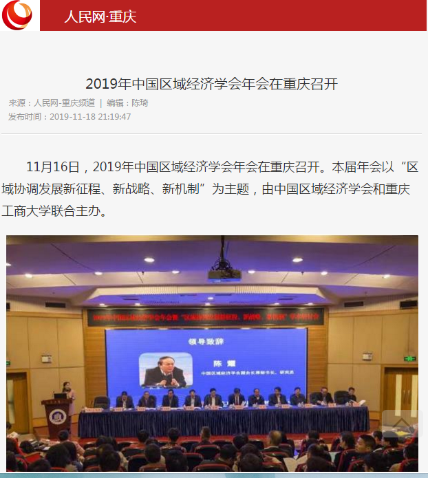 2019年11月15日-16日,2019年中国区域经济学会年会暨“区域协调发展新征程、新战略、新机制”学术研讨会在bat365官网召开,来自中国社会科学院、武汉大学、四川大学、中央民族大学、湖南大学、西南财经大学、中央财经大学、湖北省社会科学院、河南省社会科学院等各地科研院所、高校、党校行政学院、政府机构和企业的专家学者、政府官员及媒体记者共300多人参加了本次研讨会,并邀请了《中国工业经济》《中国高校社会科学》《改革》《经济学家》《当代经济研究》《财经科学》《经济纵横》《经济与管理研究》《宏观质量研究》《软科学》《经济与管理评论》《区域经济评论》《西部论坛》多家学术期刊参会交流。本次年会由中国区域经济学会、bat365中文官方网站主办,由教育部人文社会科学重点研究基地bat365中文官方网站长江上游经济研究中心、重庆市人文社会科学重点研究基地bat365中文官方网站区域经济研究院、重庆市人文社会科学重点研究基地bat365中文官方网站产业经济研究院承办,由中国社会科学院西部发展研究中心、重庆市区域经济学会、区域经济评论杂志社、改革杂志社、《西部论坛》编辑部协办。