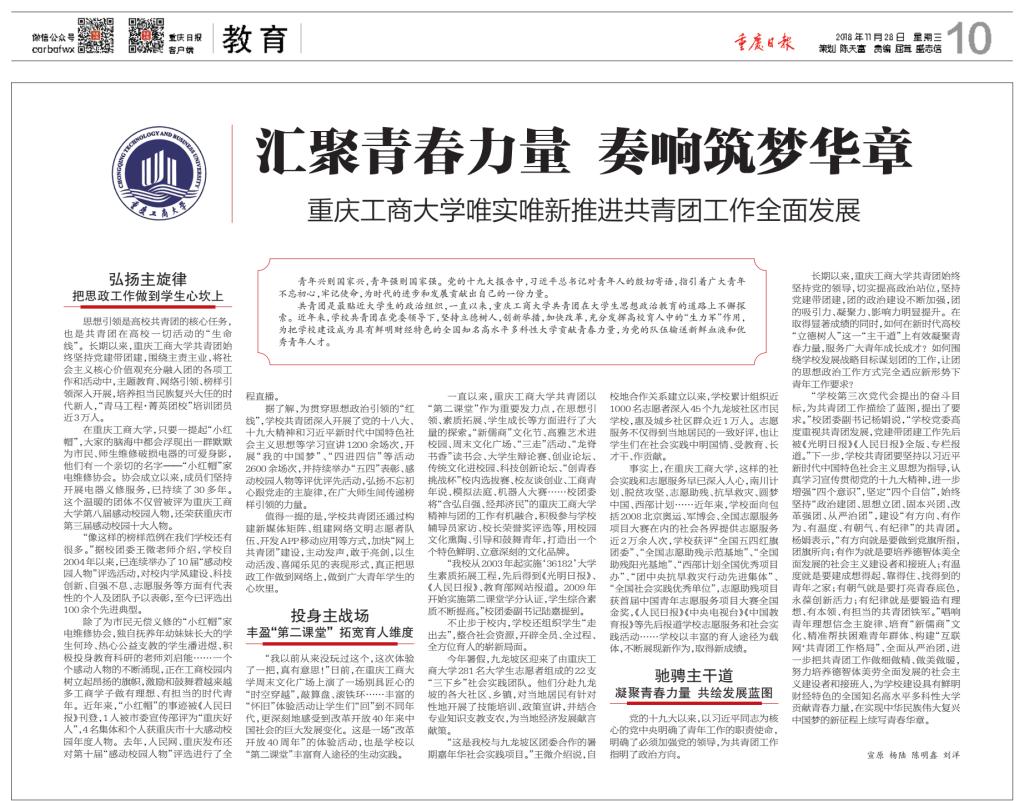 11月28日,在bat365官网第二次团代会、学代会召开之际,《重庆日报》以“汇聚青春力量 奏响筑梦华章”为题,教育版半版报道了bat365官网共青团在推进思想引领,“第二课堂”建设,“打造五有共青团”的发展蓝图等方面开展的具体工作及取得的成果,高度肯定了学校共青团的工作实效及“立德树人”的显著成效。