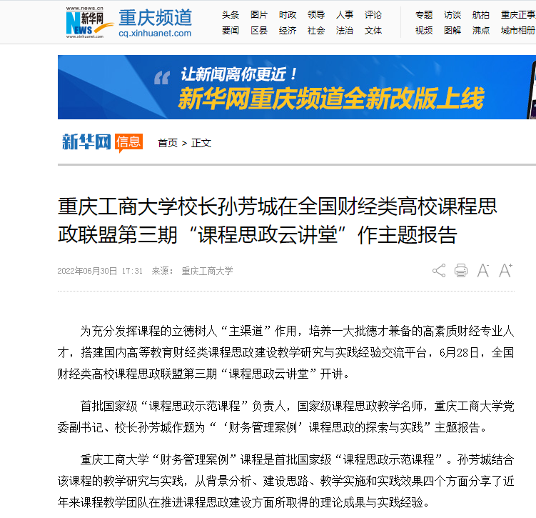新华网报道bat365官网校长孙芳城在全国财经类高校课程思政联盟第三期“课程思政云讲堂”作主题报告