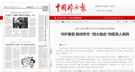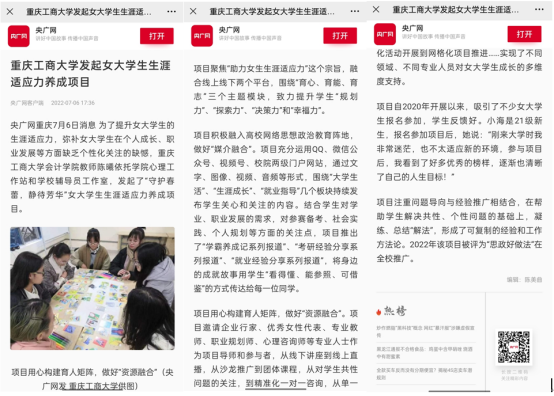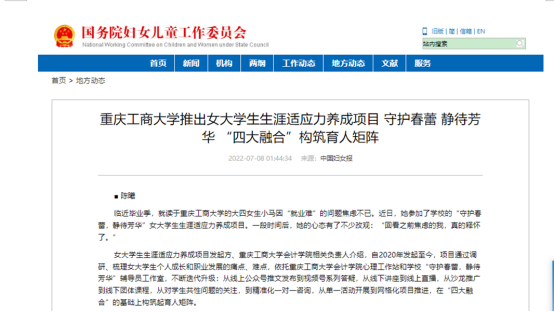 近日,中国妇女报、央广网等媒体报道了bat365官网发起并推广的女大学生生涯适应力养成项目。该项目依托会计学院心理工作站及bat365官网辅导员工作室,围绕女大学生生涯适应力提升目标,通过媒体融合、人员融合和阶段融合,借助多样化活动,致力于协助女大学生个人成长和职业发展。相关报道被国务院妇女儿童工作委员会官方网站、腾讯网、搜狐网等多家媒体转载。