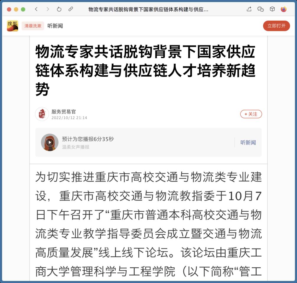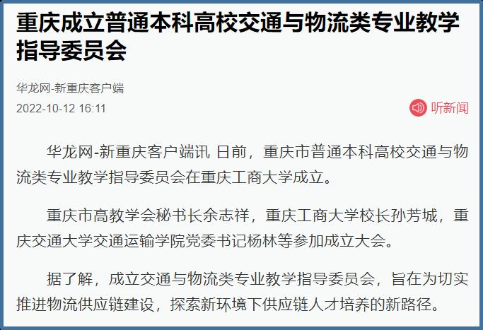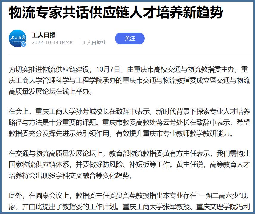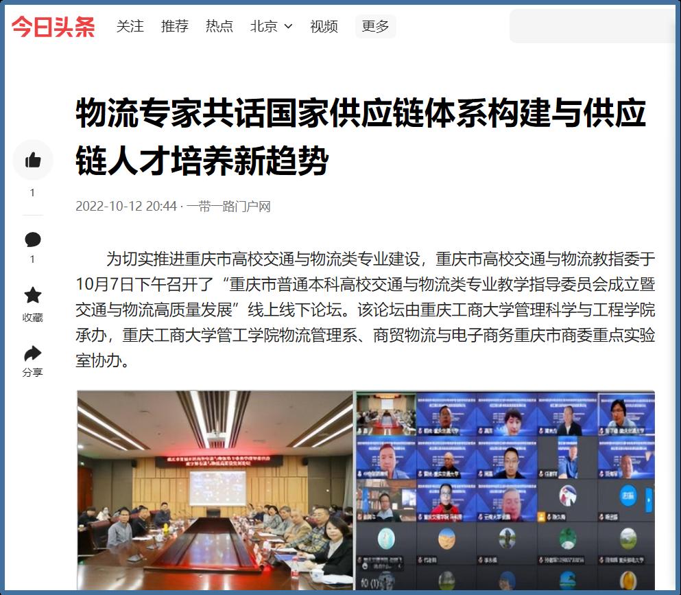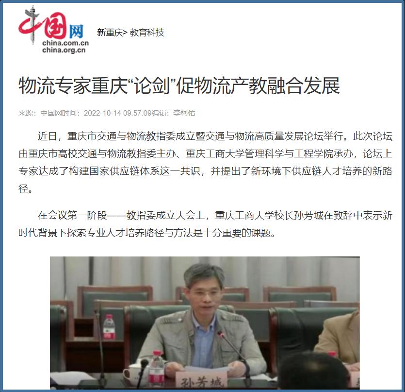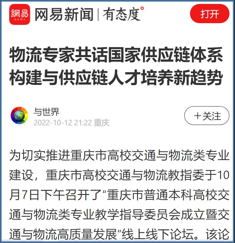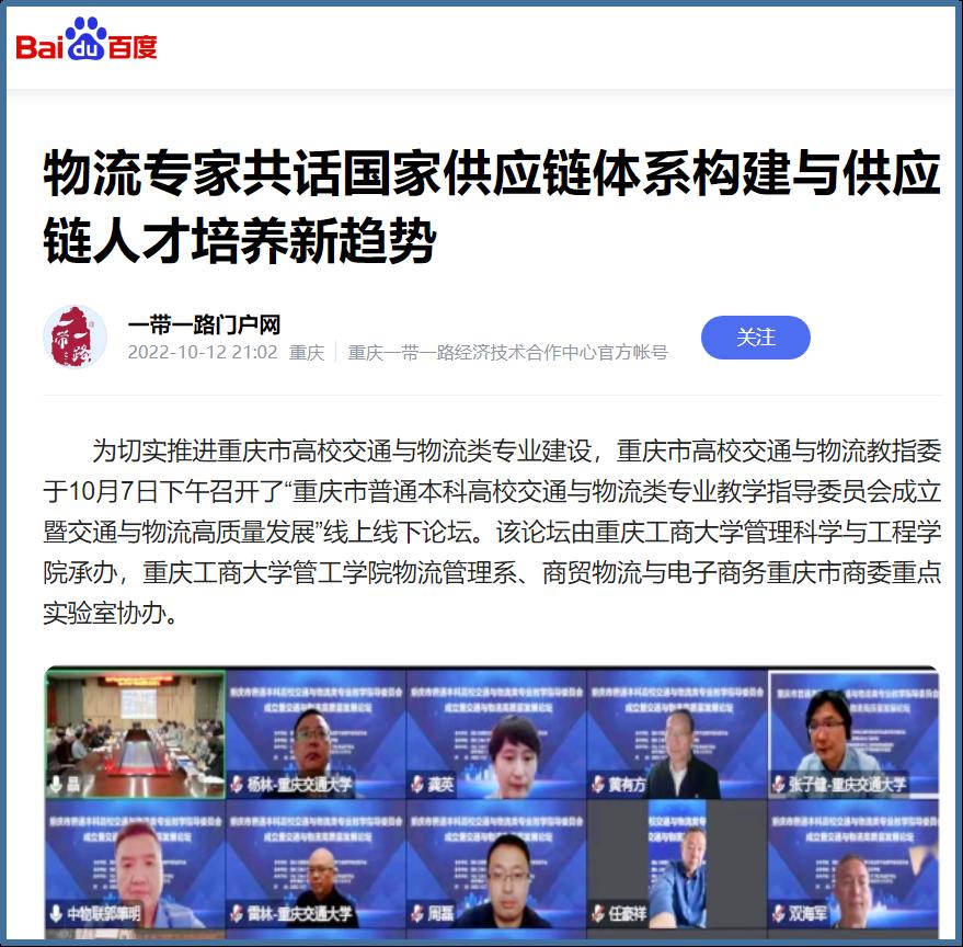 近日,中国网、工人日报、华龙网、今日头条、百度新闻、网易新闻、搜狐新闻等多家主流媒体聚焦交通与物流教指委成立、国家供应链体系构建、供应链人才培养新趋势等内容,对bat365官网成功举办“重庆市交通与物流教指委成立暨交通与物流高质量发展论坛”进行广泛报道。成立大会上,bat365中文官方网站校长孙芳城和市教委高教处处长蒋云芳致辞,高教学会秘书长余志祥宣读委员名单。论坛上教育部高校物流教指委主任黄有方、秘书长郭肇明、中国物流学会会长任豪祥、重庆市交通与物流教指委主任龚英、副主任雷林、副主任付启敏发表主旨演讲。圆桌会议上龚英、提出了工作计划,张军主任、冯利朋院长、陈坚副院长等就各自学校的一流专业经验进行了分享,其他委员为教指委的发展积极建言献策。会议由重庆市交通与物流教指委秘书长陈久梅和管理科学与工程学院院长黄钟仪副主任主持。来自教指委的委员以及全国各地物流本科院校的老师、行业协会等70余人参加本次论坛。