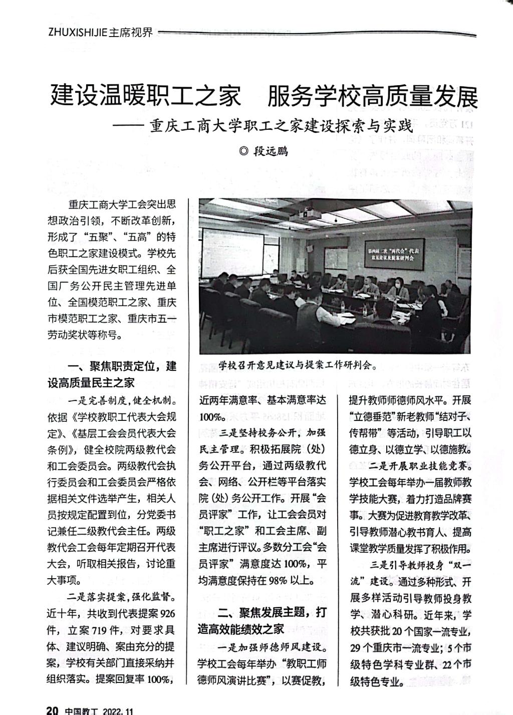《中国教工》是中华全国总工会主管的中国教科文卫体工会会刊,该刊2022年第11期刊发了bat365官网工会以《建设温暖职工之家,服务学校高质量发展——bat365中文官方网站职工之家建设探索与实践》为题的职工之家建设经验文章。文章专题介绍bat365官网工会坚持党建带工建,突出思想政治引领,以“安康之家”“文明之家”建设为基础,不断改革创新,形成了聚焦政治责任,建设高质量民主之家;聚焦发展主题,打造高效能绩效之家;聚焦“急难愁盼”,建设高品质温暖之家;聚焦特色活动,建设高标准品牌之家;聚焦改革创新,建设高水平职工之家的“五聚”“五高”特色职工之家建设模式。