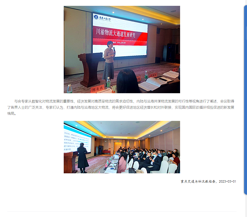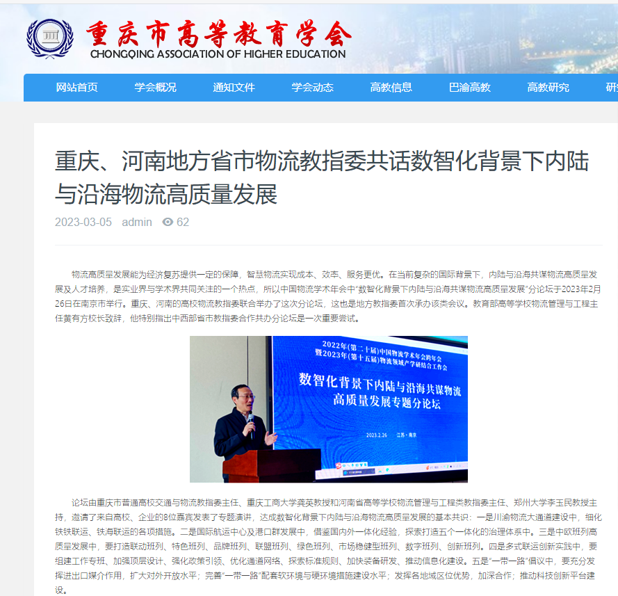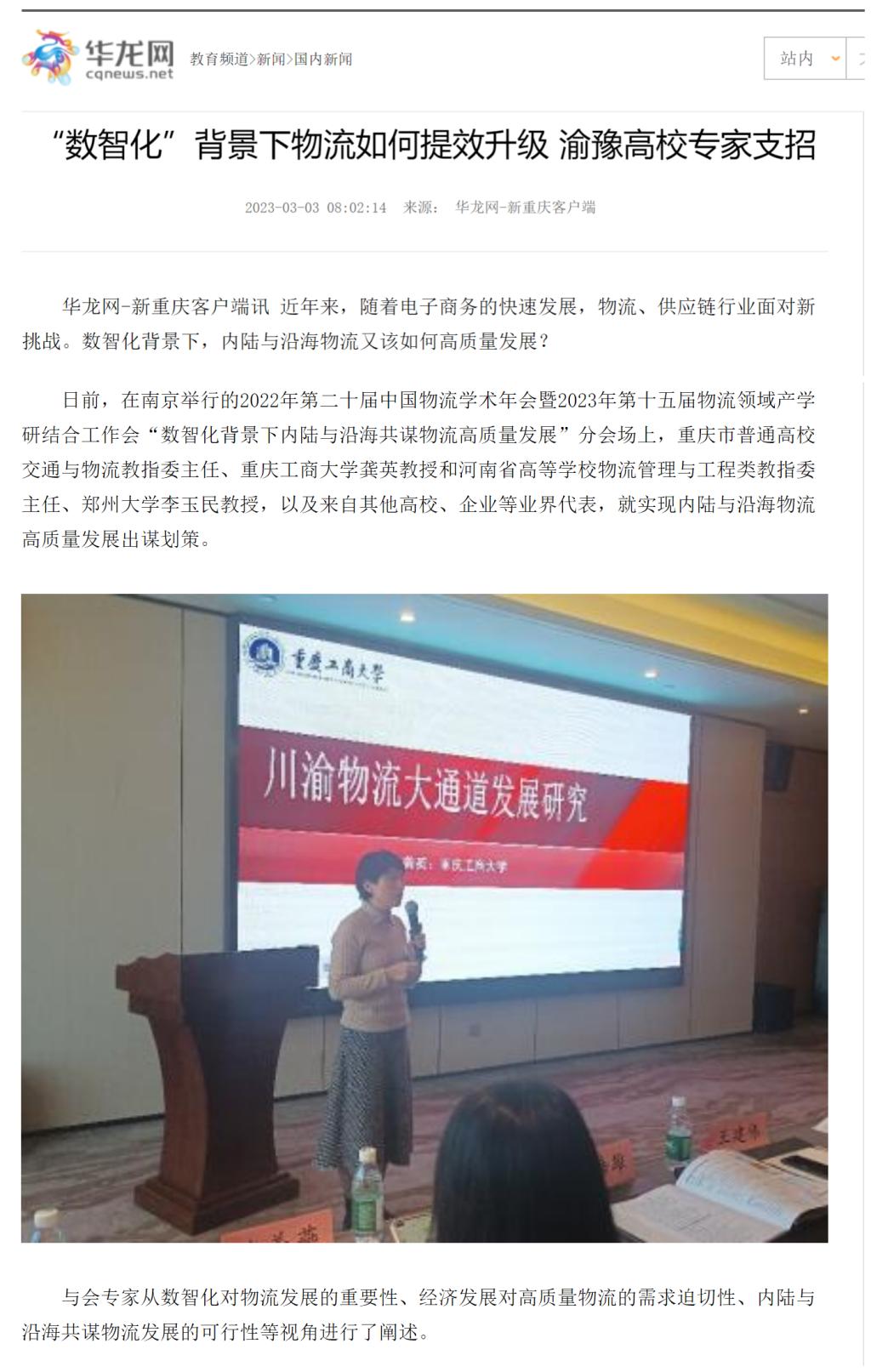 近日,中国网、华龙网等多家主流媒体聚焦“数智化”背景下内陆与沿海物流如何高质量发展出谋划策,进行广泛报道,重庆市高等教育学会也在其官方网站进行了深入报道。
