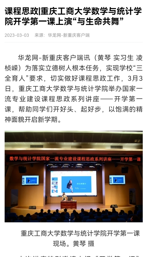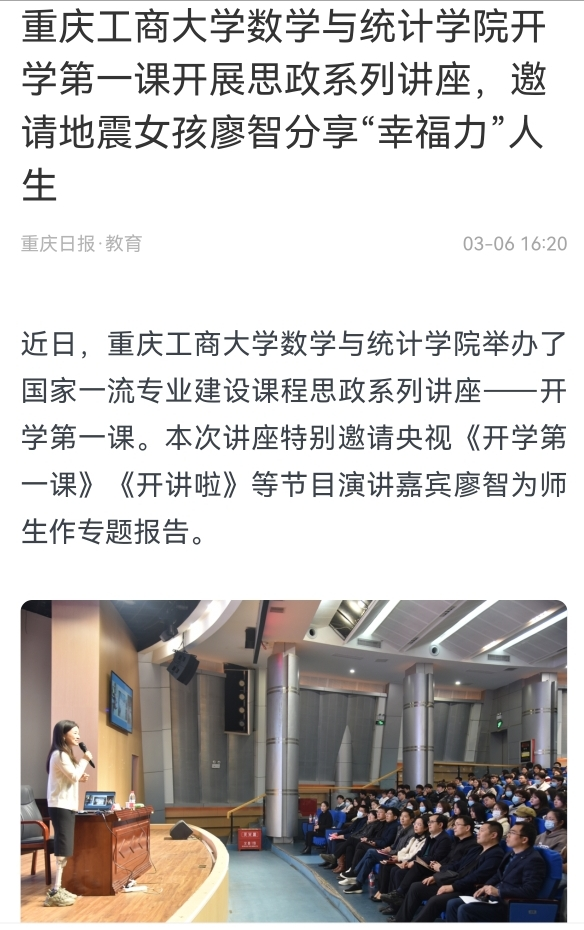 3月3日,bat365官网数学与统计学院邀请到了央视《开学第一课》《开讲啦》等节目演讲嘉宾廖智女士为师生做开学第一课的专题报告。重庆日报以《bat365中文官方网站数学与统计学院开学第一课开展思政系列讲座,邀请地震女孩廖智分享“幸福力”人生》为题,华龙网以《bat365中文官方网站数学与统计学院开学第一课上演“与生命共舞”》为题纷纷对活动进行宣传报道。