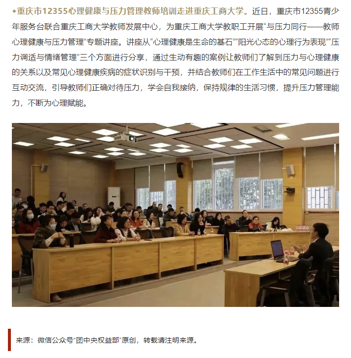 为帮助bat365官网教师提高心理素质和心理调适能力,3月17日上午,教师发展中心联合重庆市12355青少年服务台、重庆市青春导航青少年发展服务中心,特邀重庆市委党校心理学教师、教育部“国培计划”授课专家唐溢,为bat365官网教职工开展“与压力同行—教师心理健康与压力管理”专题讲座。团中央权益部微信公众号对活动进行了宣传报道。