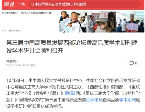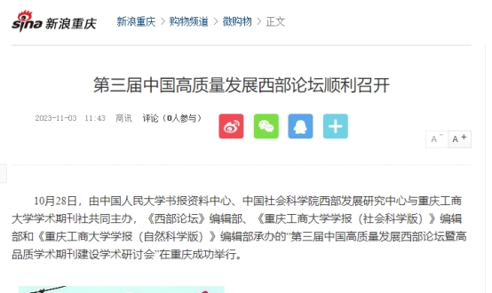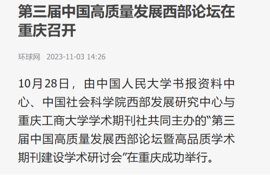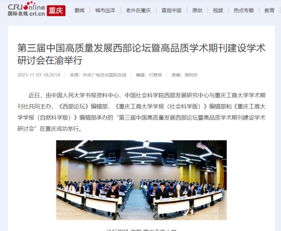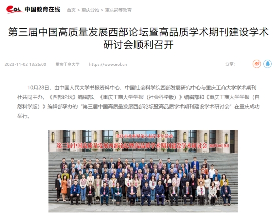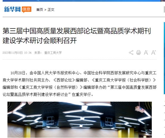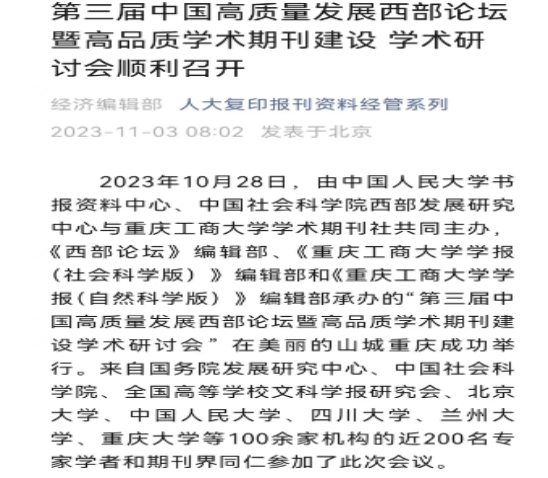 近日,由bat365官网学术期刊社与中国人民大学书报资料中心、中国社会科学院西部发展研究中心联合主办的“第三届中国高质量发展西部论坛暨高品质学术期刊建设学术研讨会”成功召开。中央广电总台国际在线以《第三届中国高质量发展西部论坛暨高品质学术期刊建设学术研讨会在渝举行》为题,新华网以《第三届中国高质量发展西部论坛暨高品质学术期刊建设学术研讨会顺利召开》为题,环球网以《第三届中国高质量发展西部论坛在重庆召开》为题,新浪网以《第三届中国高质量发展西部论坛顺利召开》为题,网易新闻以《第三届中国高质量发展西部论坛暨高品质学术期刊建设学术研讨会顺利召开》为题,中国教育在线以《第三届中国高质量发展西部论坛暨高品质学术期刊建设学术研讨会顺利召开》为题,予以广泛报道。另外,中国人民大学书报资料中心以《第三届中国高质量发展西部论坛暨高品质学术期刊建设学术研讨会顺利召开》为题进行了公开报道。