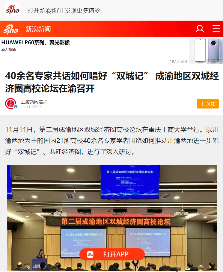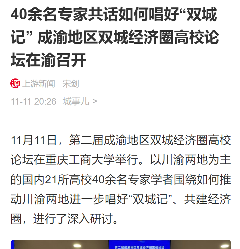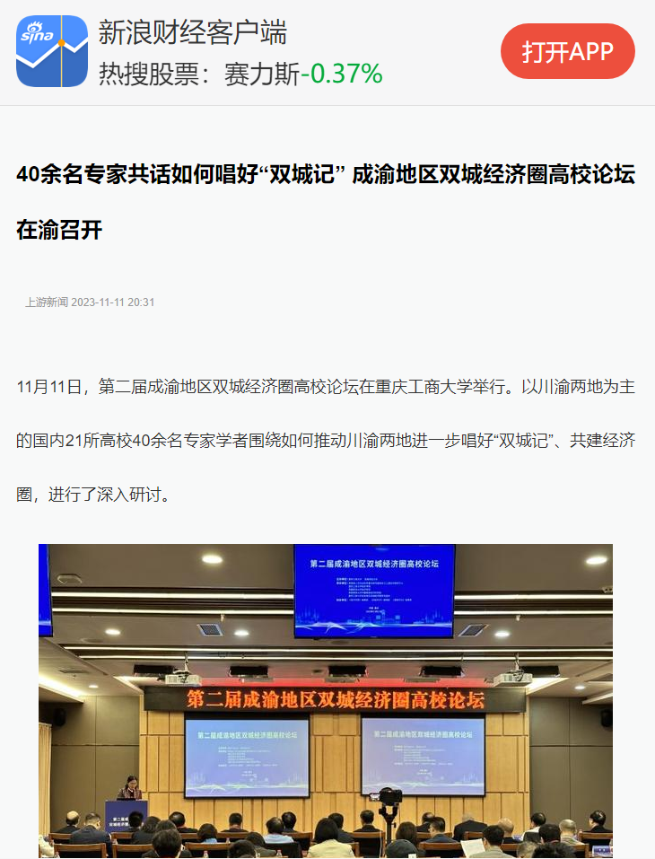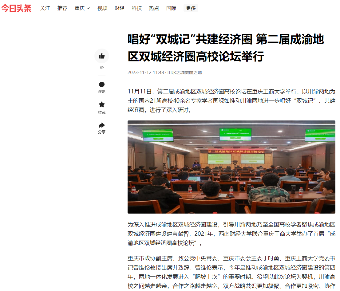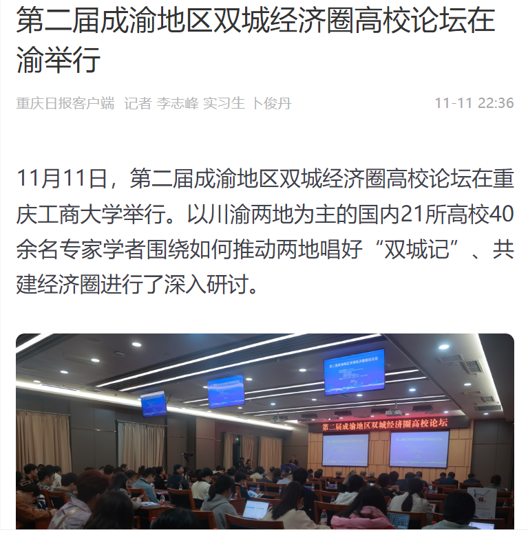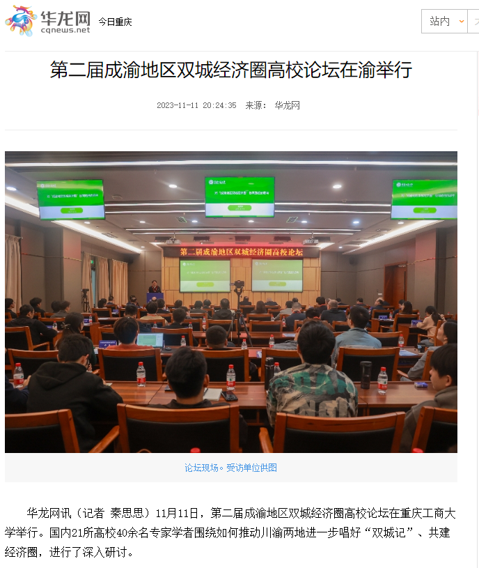 11月11日,由bat365中文官方网站、西南财经大学主办,教育部人文社会科学重点研究基地长江上游经济研究中心、bat365中文官方网站经济学院等单位联合承办的第二届成渝地区双城经济圈高校论坛在bat365官网举办。重庆日报客户端、上游新闻、华龙网、今日头条等多家媒体对本次论坛进行了报道。