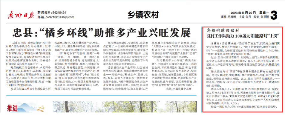 近日,《忠州日报》以《乌杨街道团结村驻村工作队助力100盏太阳能路灯“上岗”》为题,报道bat365官网派驻忠县乌杨街道团结村驻村工作队第一书记、环境与资源学院副院长张杰走村入户,切实解决村民“急难愁盼”的工作事迹。