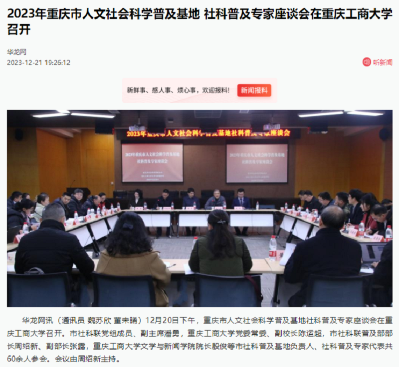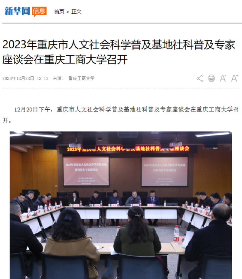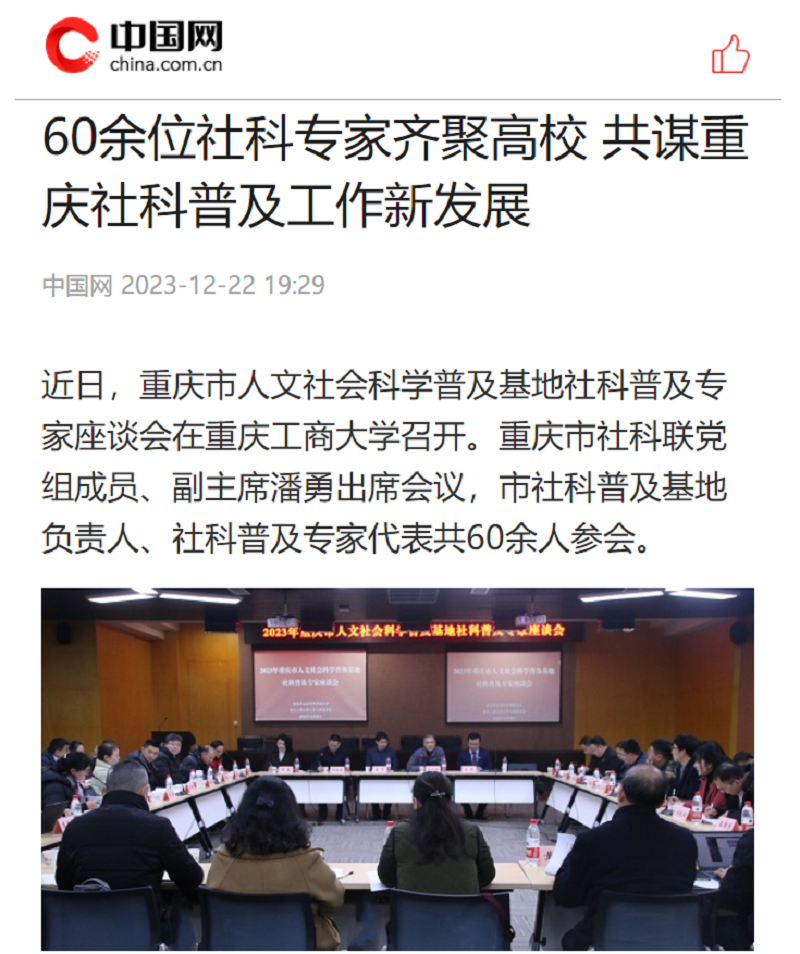 近日,新华网以《2023年重庆市人文社会科学普及基地社科普及专家座谈会在bat365中文官方网站召开》为题;中国网以《60余位社科专家齐聚高校 共谋重庆社科普及工作新发展》;华龙网以《2023年重庆市人文社会科学普及基地 社科普及专家座谈会在bat365中文官方网站召开》为题,报道bat365官网召开2023年重庆市人文社会科学普及基地社科普及专家座谈会。