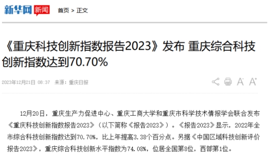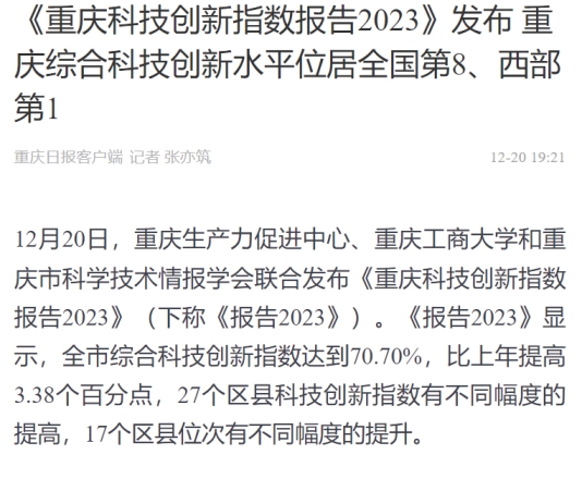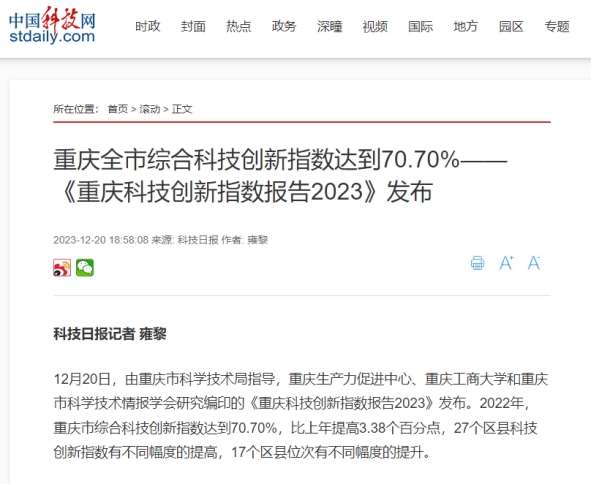 12月20日,重庆生产力促进中心、bat365中文官方网站和重庆市科学技术情报学会联合发布《重庆科技创新指数报告2023》。该报告由bat365中文官方网站数学与统计学院“重庆科技创新指数编制”项目组研究完成。新华网、中国科技网、重庆日报客户端、上游新闻、七一网、搜狐网、新浪网等多家媒体对本次发布会进行了报道。