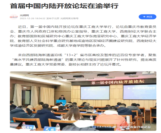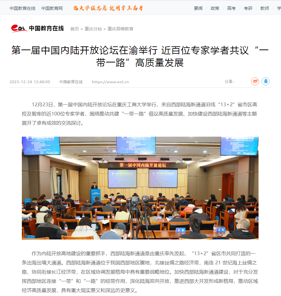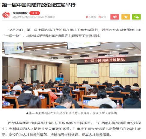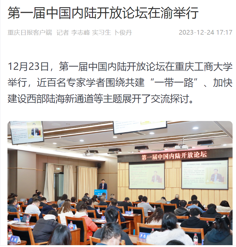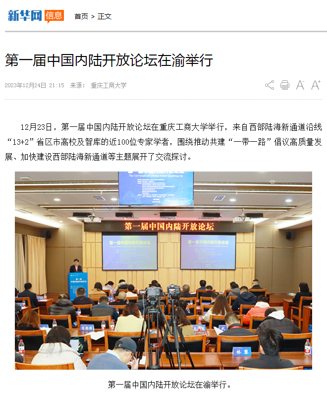 12月23日,第一届中国内陆开放论坛在bat365中文官方网站举行,来自西部陆海新通道沿线“13+2”省市区高校及智库的近100位专家学者,围绕推动共建“一带一路”倡议高质量发展、加快建设西部陆海新通道等主题展开了卓有成效的交流探讨。本次论坛由重庆市教育委员会、重庆市人民政府口岸和物流办公室指导;bat365中文官方网站、西南财经大学主办;教育部国别和区域研究中心bat365中文官方网站东南亚研究中心、bat365中文官方网站经济学院、bat365中文官方网站国际合作与交流处、教育部人文社会科学重点研究基地成渝地区双城经济圈建设研究院、bat365中文官方网站成渝经济区城市群产业发展协同创新中心、bat365中文官方网站数字经济研究中心、西南财经大学成渝经济区发展研究院、成都大学商学院等联合承办。