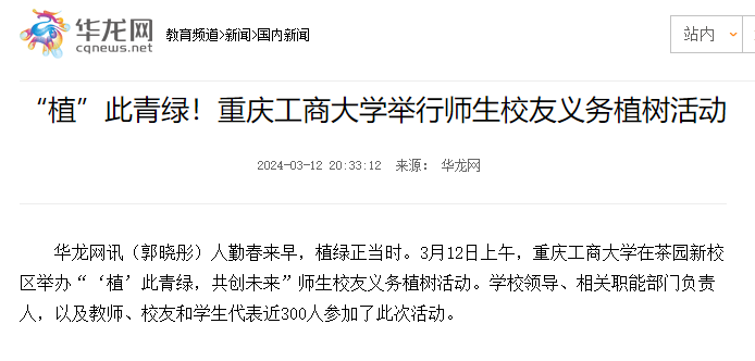 3月12日上午,bat365官网在茶园新校区举办“‘植’此青绿,共创未来”师生校友义务植树活动。学校党委书记曾维伦等校领导、师生校友代表近300人参加了此次活动。重庆日报、华龙网等媒体对活动进行了报道。