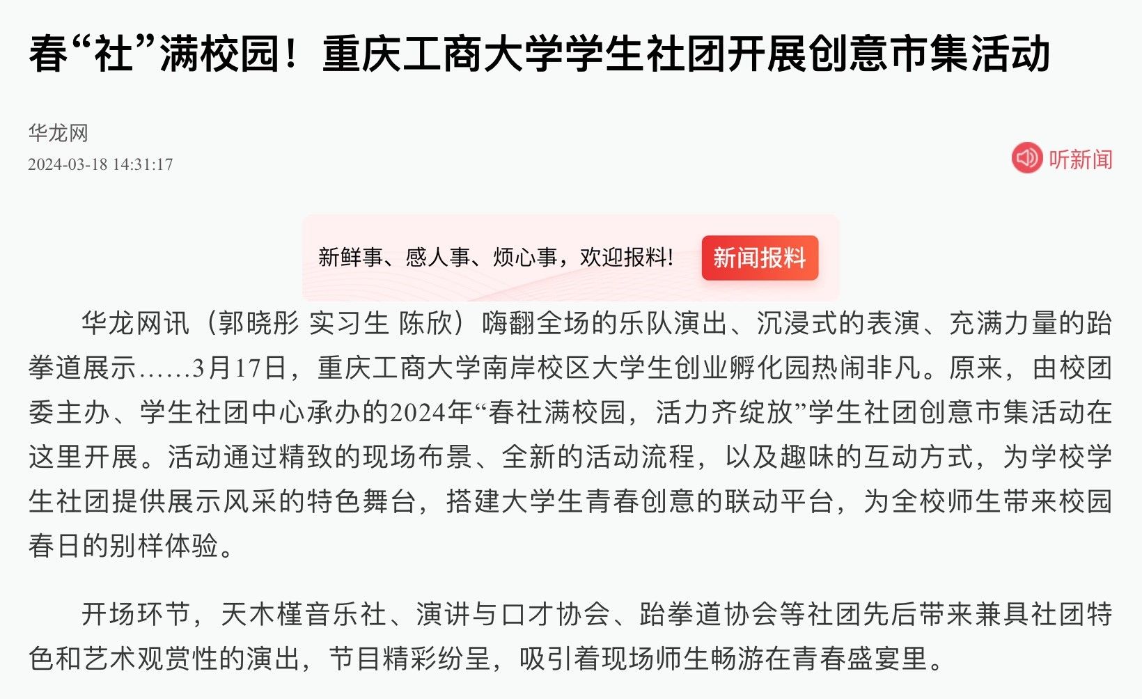 3月17日下午,bat365官网在南岸校区举办2024年“春社满校园,活力齐绽放”学生社团创意市集活动。华龙网对活动进行了报道。