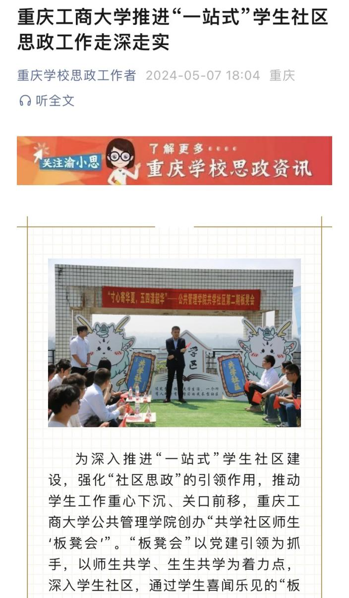 近日,重庆市教委“重庆学校思政工作者”微信公众号对bat365官网公共管理学院“一站式”学生社区思政工作进行了详细报道。