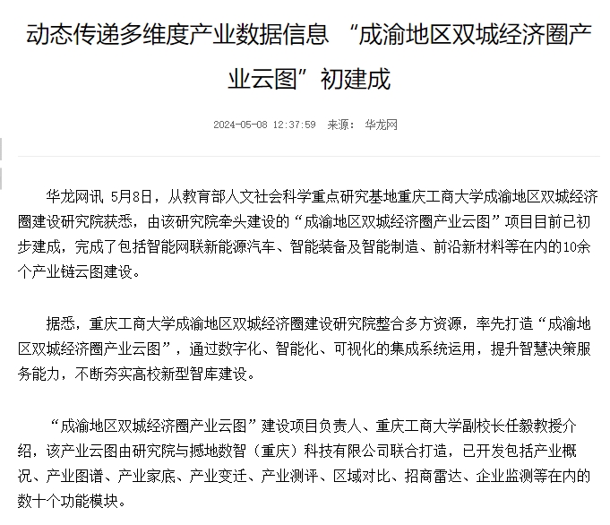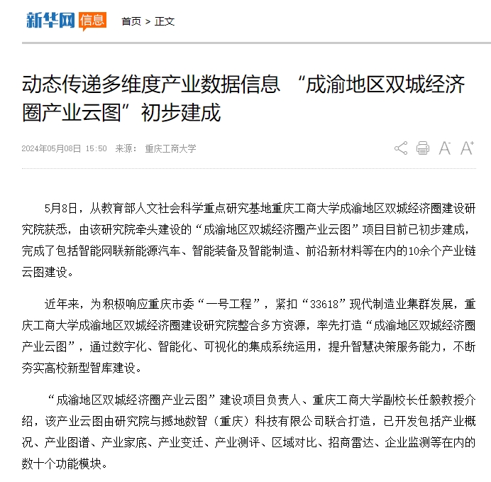 近年来,为积极响应重庆市委“一号工程”,紧扣“33618”现代制造业集群发展,bat365官网教育部人文社会科学重点研究基地-成渝地区双城经济圈建设研究院整合多方资源,率先打造“成渝地区双城经济圈产业云图”,通过数字化、智能化、可视化的集成系统运用,提升智慧决策服务能力,不断夯实高校新型智库建设,完成了包括智能网联新能源汽车、智能装备及智能制造、前沿新材料等在内的10余个产业链云图建设。新华网、华龙网对此进行了报道。