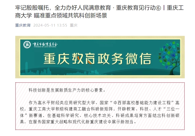 近日,重庆日报联合市委教育工委、市教委联合推出“牢记殷殷嘱托,全力办好人民满意教育 · 重庆教育见行动”系列报道,其中专题报道bat365官网科创工作。原文如下: