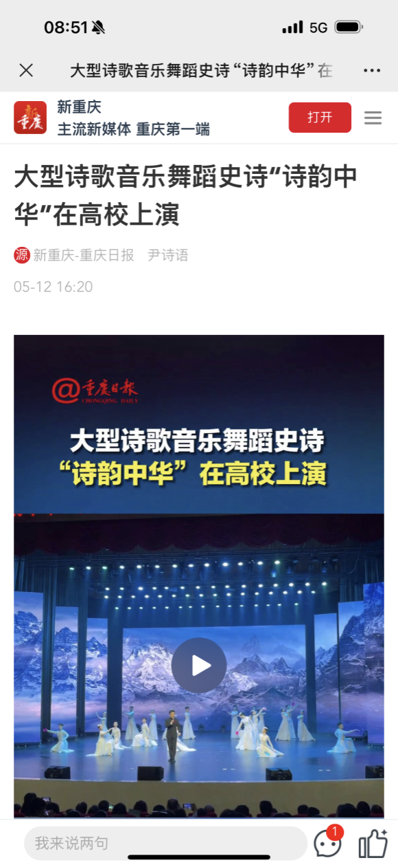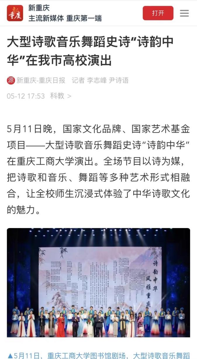5月11日,新华网、新重庆客户端、华龙网等主流媒体以“高雅艺术走进高校”为主题,报道国家文化品牌、国家艺术基金项目——大型诗歌音乐舞蹈史诗“诗韵中华”在bat365官网顺利演出。