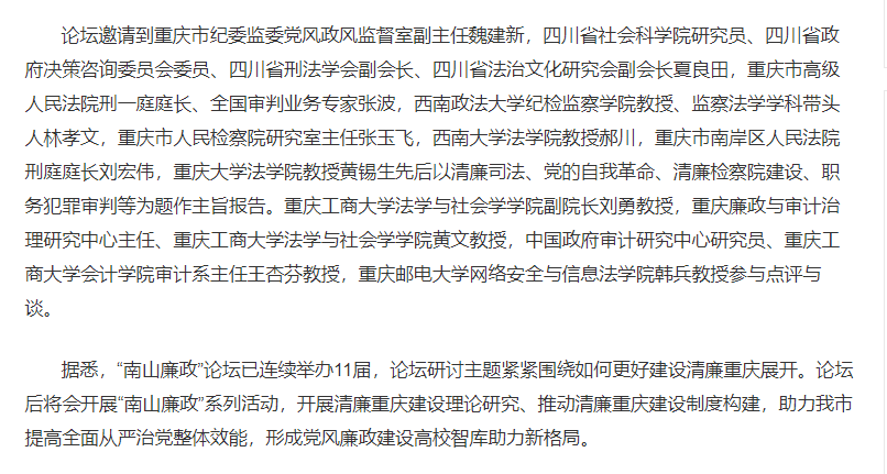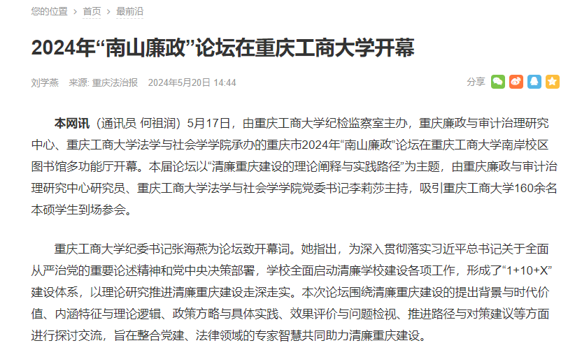 5月20日,《重庆法治报》报道bat365官网举办2024年“南山廉政”论坛。