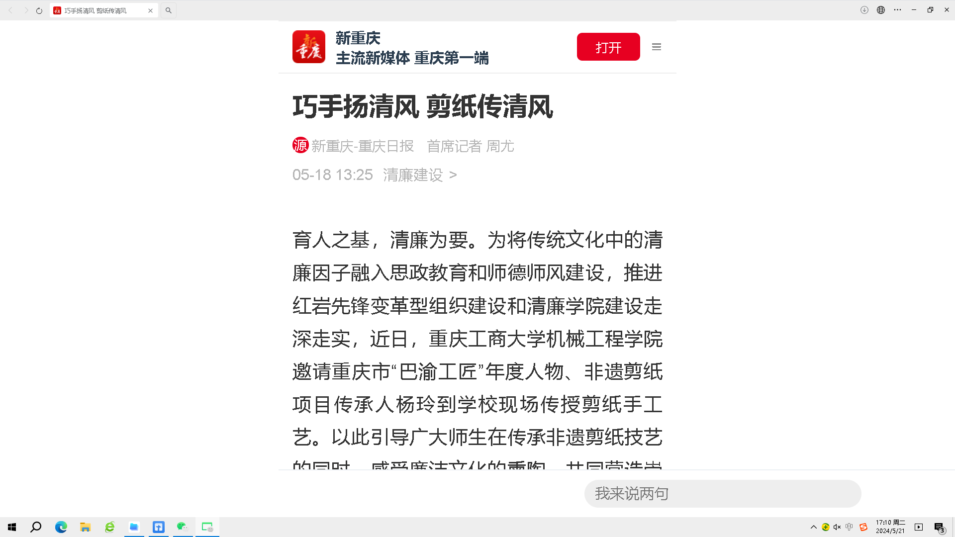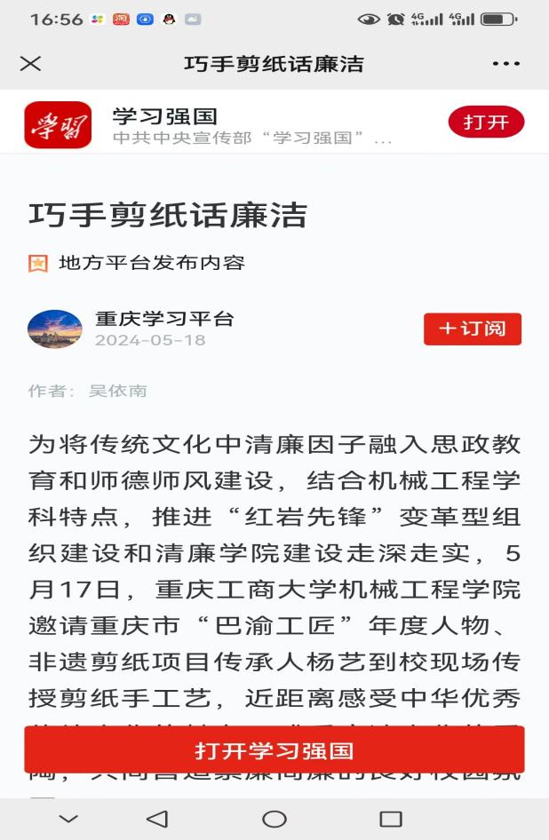 学习强国、新重庆客户端报道bat365官网机械工程学院“巧手剪纸话廉洁”活动