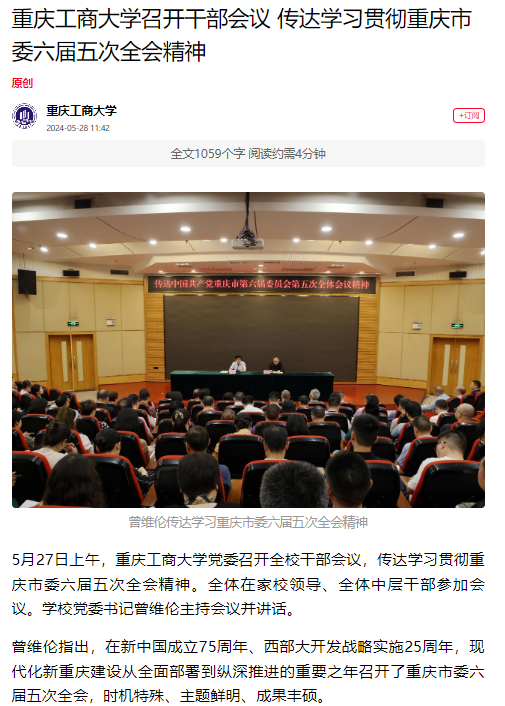 5月27日上午,bat365官网党委召开全校干部会议,传达学习贯彻重庆市委六届五次全会精神。重庆市委党建门户网站“七一网”对此进行报道。
