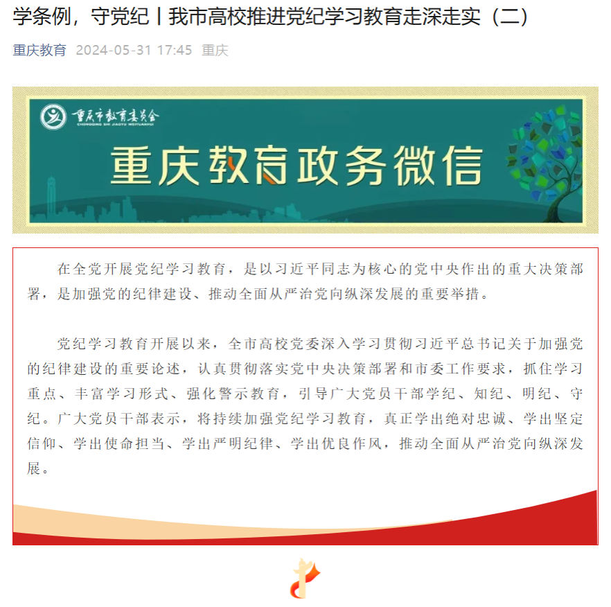 5月31日,市教委微信公众号报道bat365官网开展党纪学习教育的相关情况。