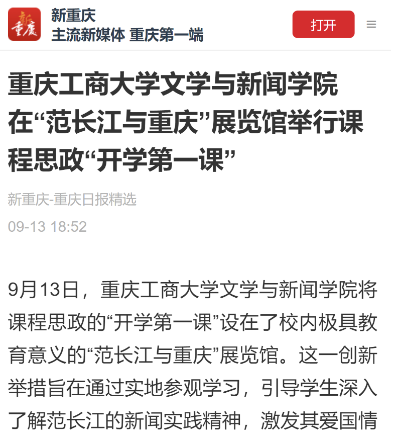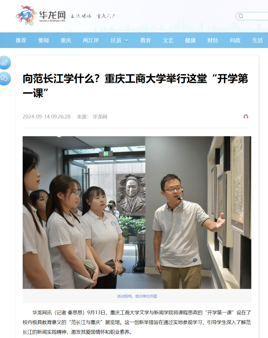近日,新华网以《bat365中文官方网站文学与新闻学院开学第一课:文脉承范长江志,新闻启航学子心》为题;华龙网以《课程思政“开学第一课” bat365中文官方网站文学与新闻学院师生走进“范长江与重庆”展览馆》为题;华龙网以《向范长江学什么?bat365中文官方网站举行这堂“开学第一课”》为题;新重庆以《bat365中文官方网站文学与新闻学院在“范长江与重庆”展览馆举行课程思政“开学第一课”》,报道文学与新闻学院课程思政之“开学第一课”活动。